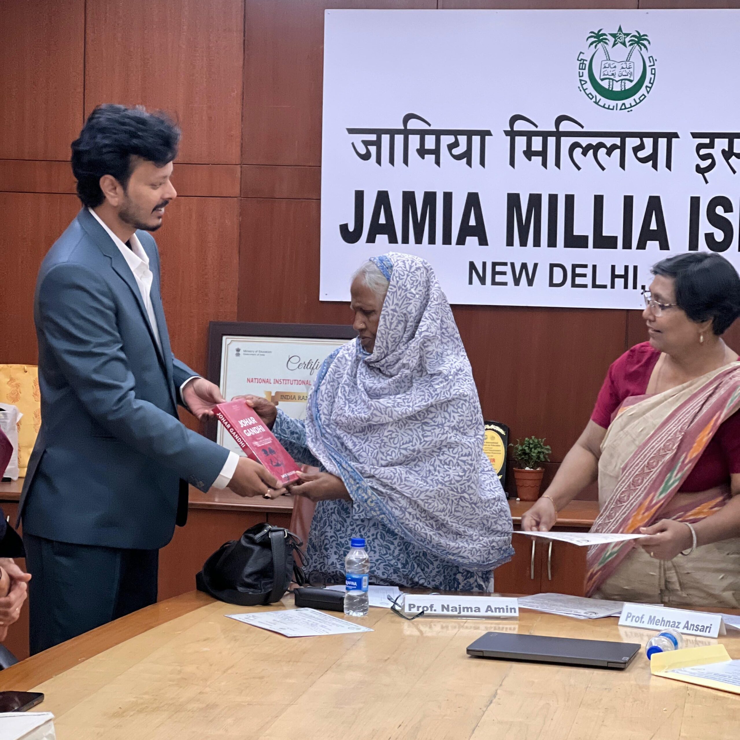 इस अवसर पर अमीर हाशमी ने अपनी ओर से जामिया मिलिया इस्लामिया विश्वविद्यालय के शिक्षा संकाय को उनकी पूर्व प्रकाशित पुस्तक “जोहर गांधी” भेंट स्वरूप प्रदान की। यह पुस्तक छत्तीसगढ़ के मूल स्वतंत्रता सेनानियों, महिला स्वतंत्रता सेनानियों तथा आदिवासी स्वतंत्रता संग्राम सेनानियों के संघर्षों और योगदानों पर आधारित है। हाशमी ने यह कृति विश्वविद्यालय के इतिहास विभाग, शिक्षा विभाग एवं पुस्तकालय को समर्पित करते हुए छत्तीसगढ़ के स्वतंत्रता संग्राम की गौरवगाथा को शैक्षणिक जगत से जोड़ने का प्रयास किया।