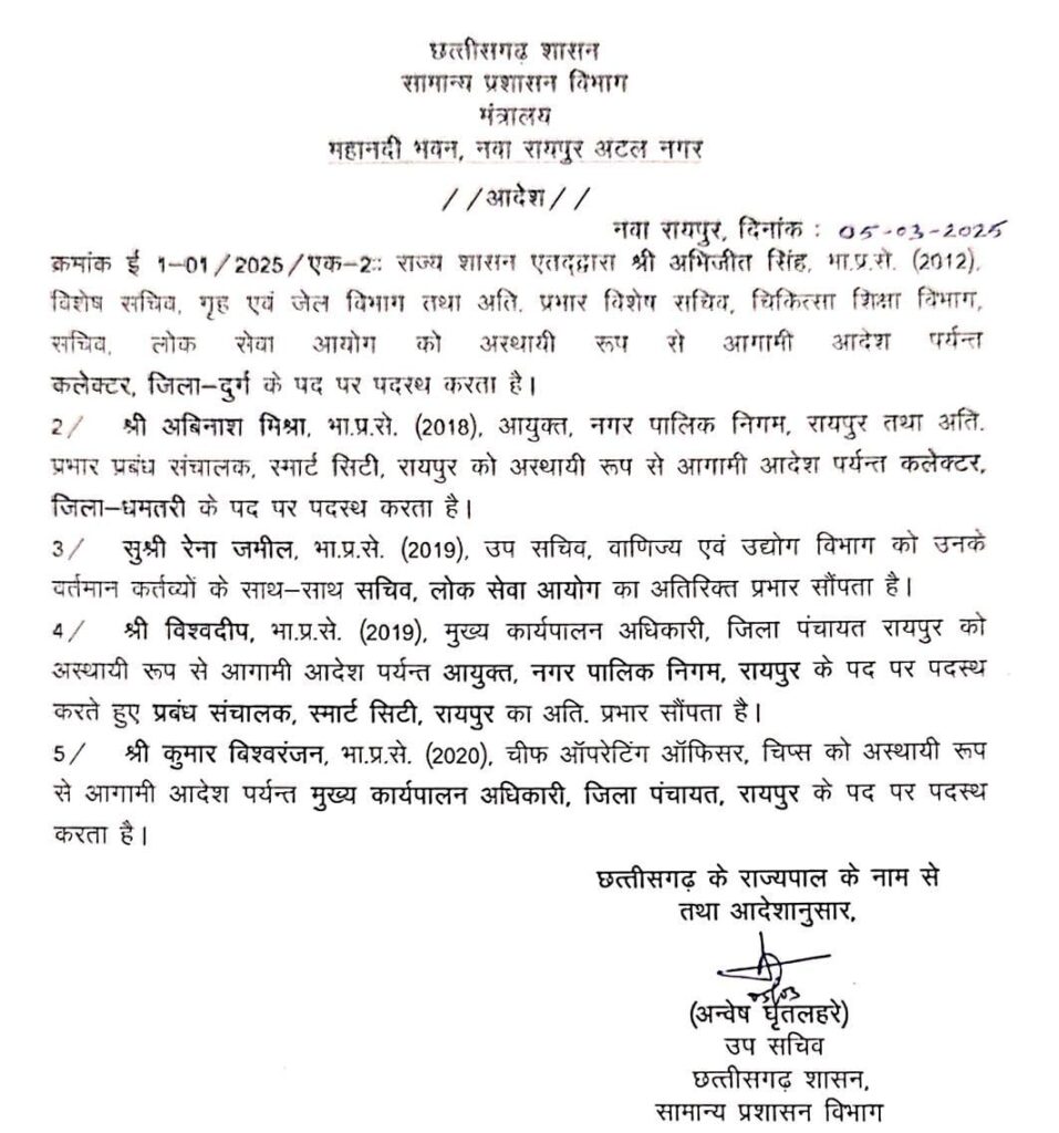 2018 बैच के भारतीय प्रशासनिक सेवा (IAS) अधिकारी अबिनाश मिश्रा को धमतरी जिले का नया कलेक्टर नियुक्त किया गया है।