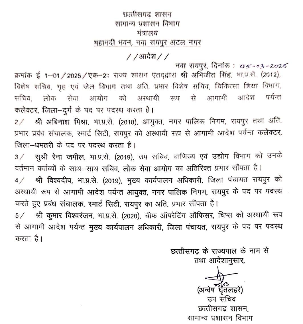2018 बैच के भारतीय प्रशासनिक सेवा (IAS) अधिकारी अबिनाश मिश्रा को धमतरी जिले का नया कलेक्टर नियुक्त किया गया है।