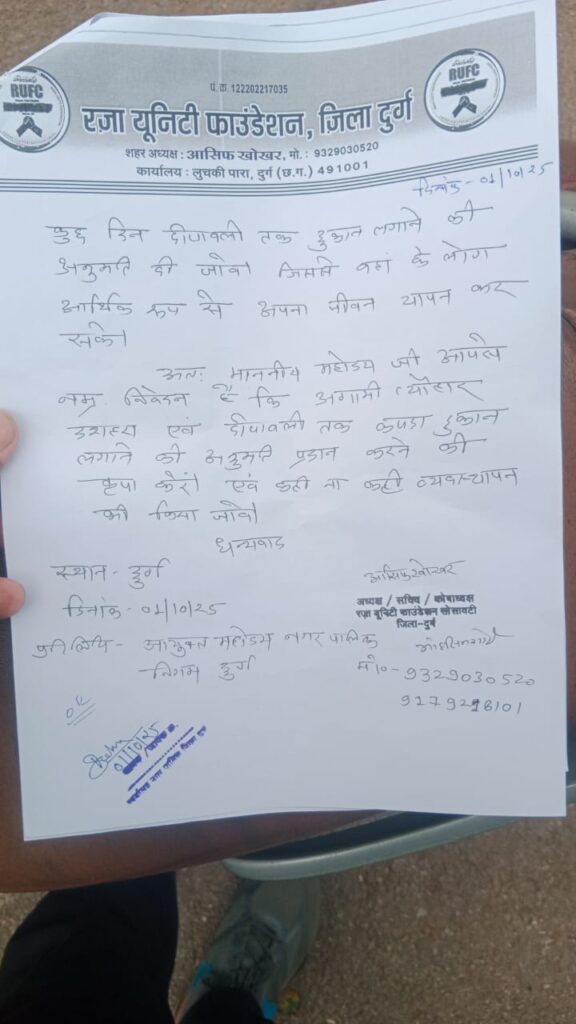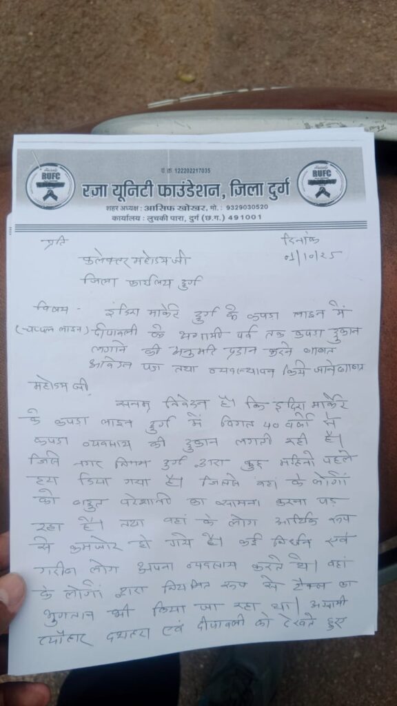 दुर्ग/ इंदिरा मार्केट स्थित हुर्ग के कपड़ा लाइन (चप्पल लाइन) के व्यवसायियों ने आगामी दशहरा एवं दीपावली त्योहारों तक अस्थायी रूप से दुकानें लगाने की अनुमति मांगते हुए आज एक ज्ञापन कलेक्टर को ज्ञापन सौपा है। इस मांग का समर्थन करते हुए स्थानीय संगठन रज़ा युनिटी फाउंडेशन दुर्ग ने भी अपनी आवाज बुलंद की।