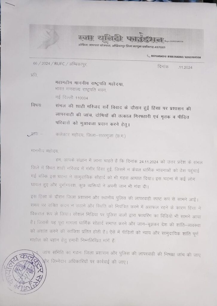 रज़ा यूनिटी फाउंडेशन, जिला सरगुजा (छत्तीसगढ़) के प्रतिनिधियों ने आज राष्ट्रपति, भारत गणराज्य के नाम एक ज्ञापन सौंपा। ज्ञापन में उत्तर प्रदेश के संभल जिले में शाही मस्जिद में हुई हिंसा पर गहरी चिंता व्यक्त करते हुए दोषियों की गिरफ्तारी और पीड़ित परिवारों को न्याय दिलाने की मांग की गई।