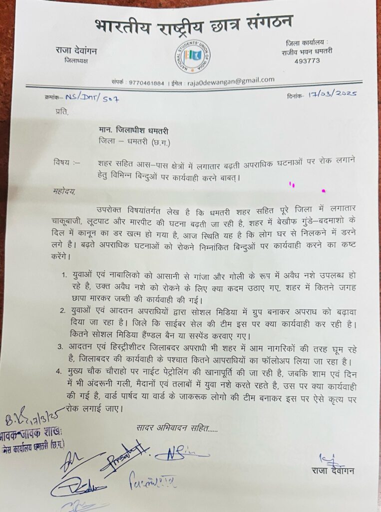 एनएसयूआई जिलाध्यक्ष राजा देवांगन ने कहा कि शहर में लगातार आपराधिक गतिविधियां बढ़ रही हैं युवा नशे की चपेट में आ रहे हैं, धमतरी में युवाओं को आसानी से नशीले पदार्थों मिल रहे है जिसके चपेट में आकर युवा आपराधिक गतिविधियों में संलिप्त हो चुके हैं।