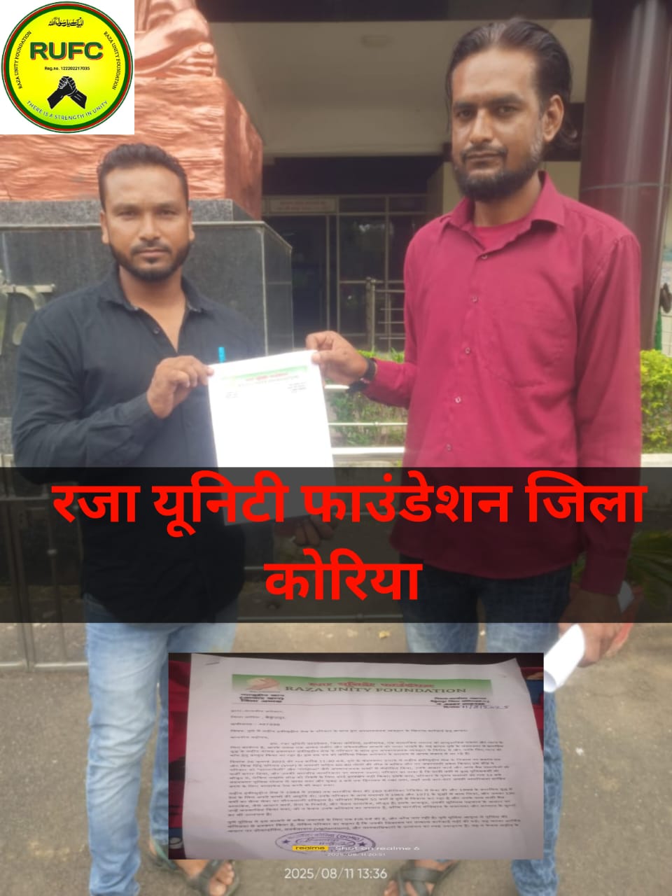 कोरिया/ रजा यूनिटी फाउंडेशन के अध्यक्ष नेयाजुद्दीन खान ने आज कोरिया कलेक्टर को एक ज्ञापन सौंपा, जो कलेक्टर के माध्यम से भारत के राष्ट्रपति को प्रेषित किया जाएगा। यह ज्ञापन असम में मुसलमानों की बेदखली और धार्मिक स्वतंत्रता से जुड़े गंभीर मुद्दों को उठाता है। इस कदम के जरिए फाउंडेशन ने देश के सर्वोच्च संवैधानिक पद पर अपनी चिंताएं पहुंचाने का प्रयास किया है।