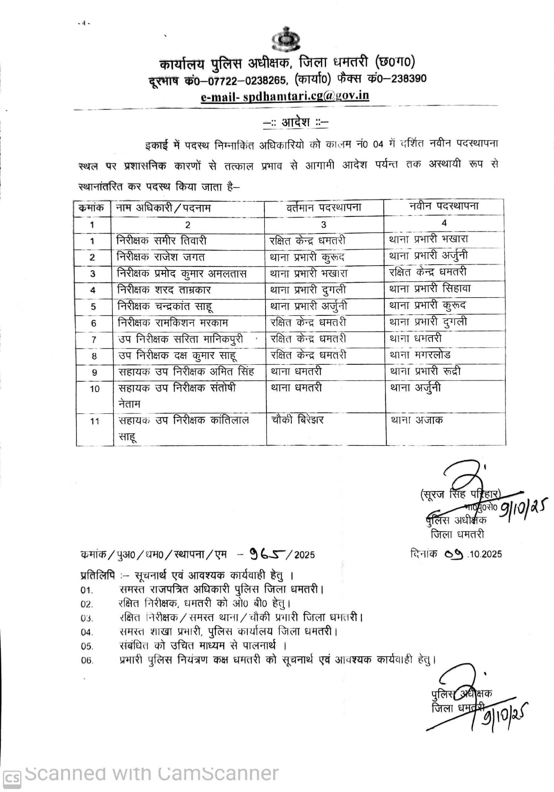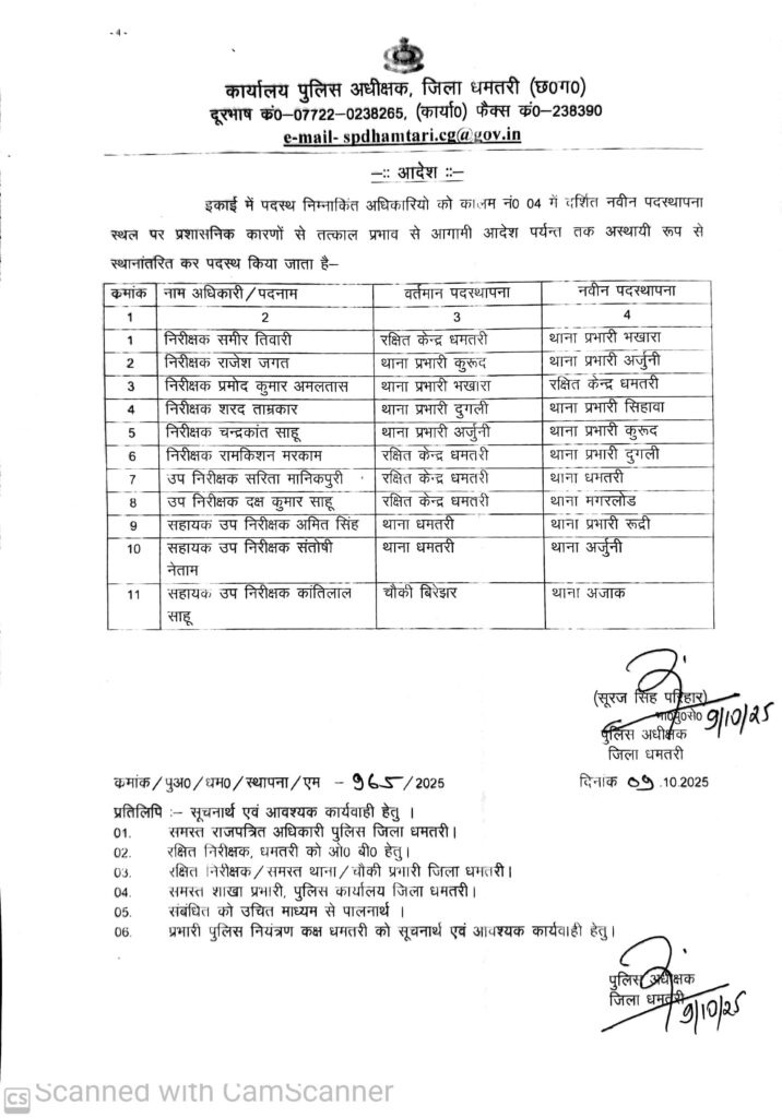 धमतरी/जिले में पुलिसिंग को और अधिक सशक्त एवं प्रभावी बनाने के उद्देश्य से पुलिस अधीक्षक द्वारा जिले के 06 थानों में थाना प्रभारियों का स्थानांतरण आदेश जारी किया गया है। पुलिसिंग में अनुशासन, उत्तरदायित्व और फील्ड एक्टिविटी को और सशक्त करने की मंशा से यह बदलाव किया गया हैं, ताकि जिले में अपराधों पर त्वरित नियंत्रण, कानून व्यवस्था की मजबूती तथा जनता में पुलिस के प्रति विश्वास और बढ़ सके।