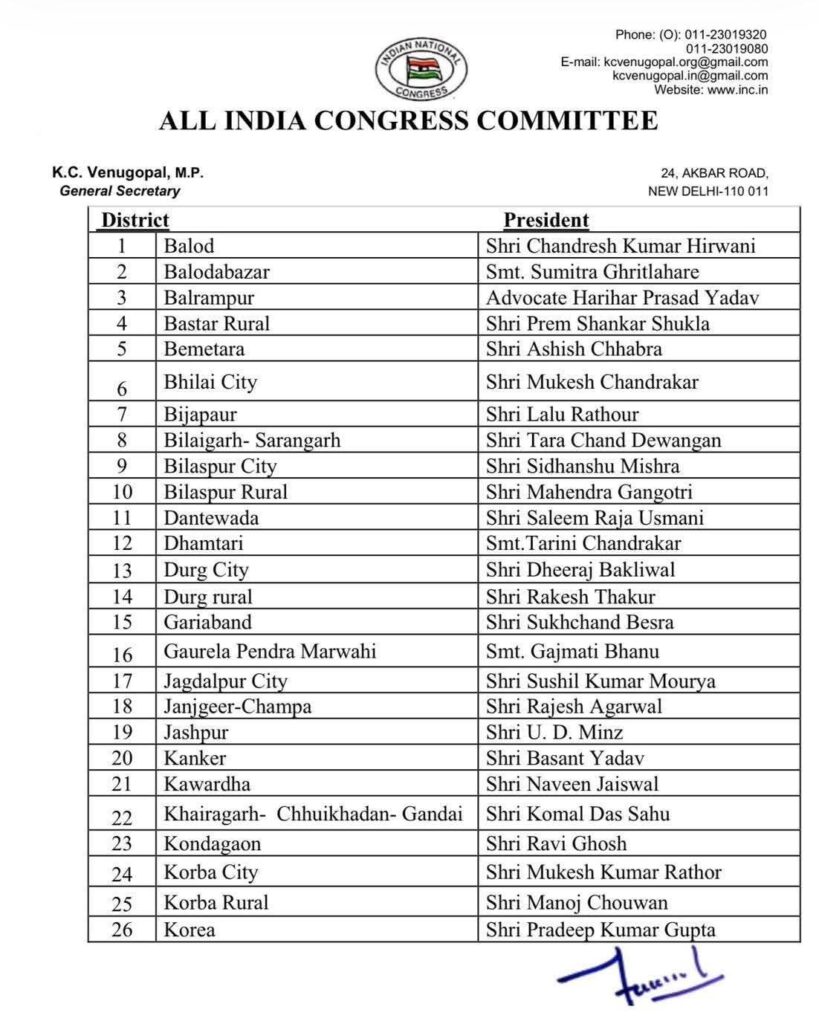 कांग्रेस ने छत्तीसगढ़ व धमतरी जिले के सभी जिला अध्यक्षों की सूची जारी करदी है जिसमे धमतरीं जिले की कमान कुरुद निवासी तारणी चंद्राकर को दी है..