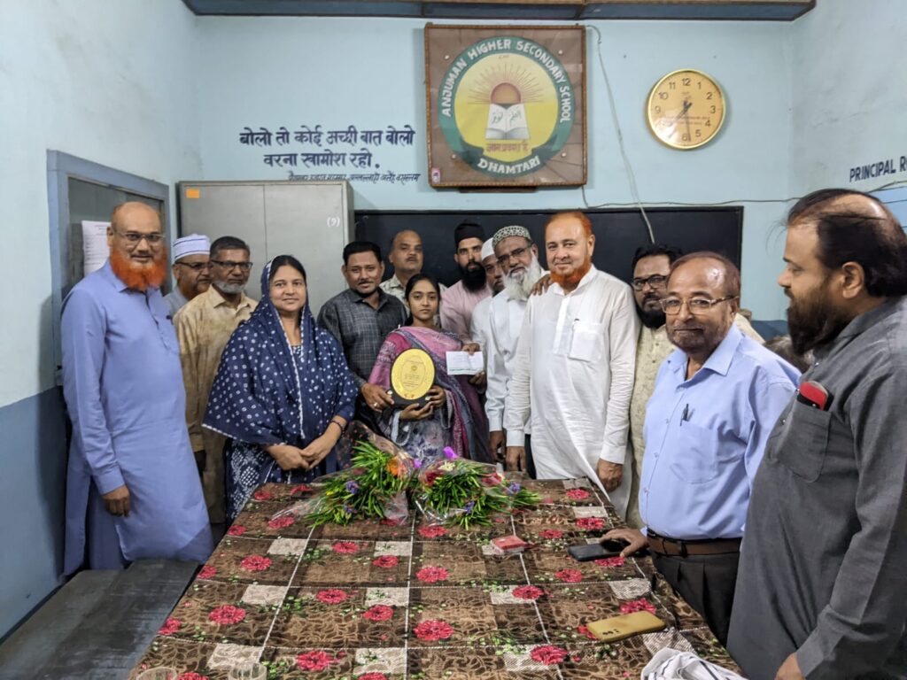 धमतरी/ मुस्लिम समाज की गौरव दसवीं की होनहार छात्रा काफिया परवीन ने शिक्षा सत्र 2024-25 में कक्षा दसवीं की बोर्ड परीक्षा में 93.16 प्रतिशत अंक हासिल कर टैलेंट पब्लिक स्कूल, परिवार और समाज को गौरवान्वित किया है। टैलेंट पब्लिक स्कूल में अध्यनरत छात्रा काफिया परवीन पिता मरहूम शेख आसिफ की इस उपलब्धि पर अंजुमन इस्लामिया कमेटी ने अंजुमन स्कूल में उसे सम्मानित किया। काफिया को यादगार भेंट और 3100 रुपए प्रदान कर उसके हुनर को सलाम किया गया।