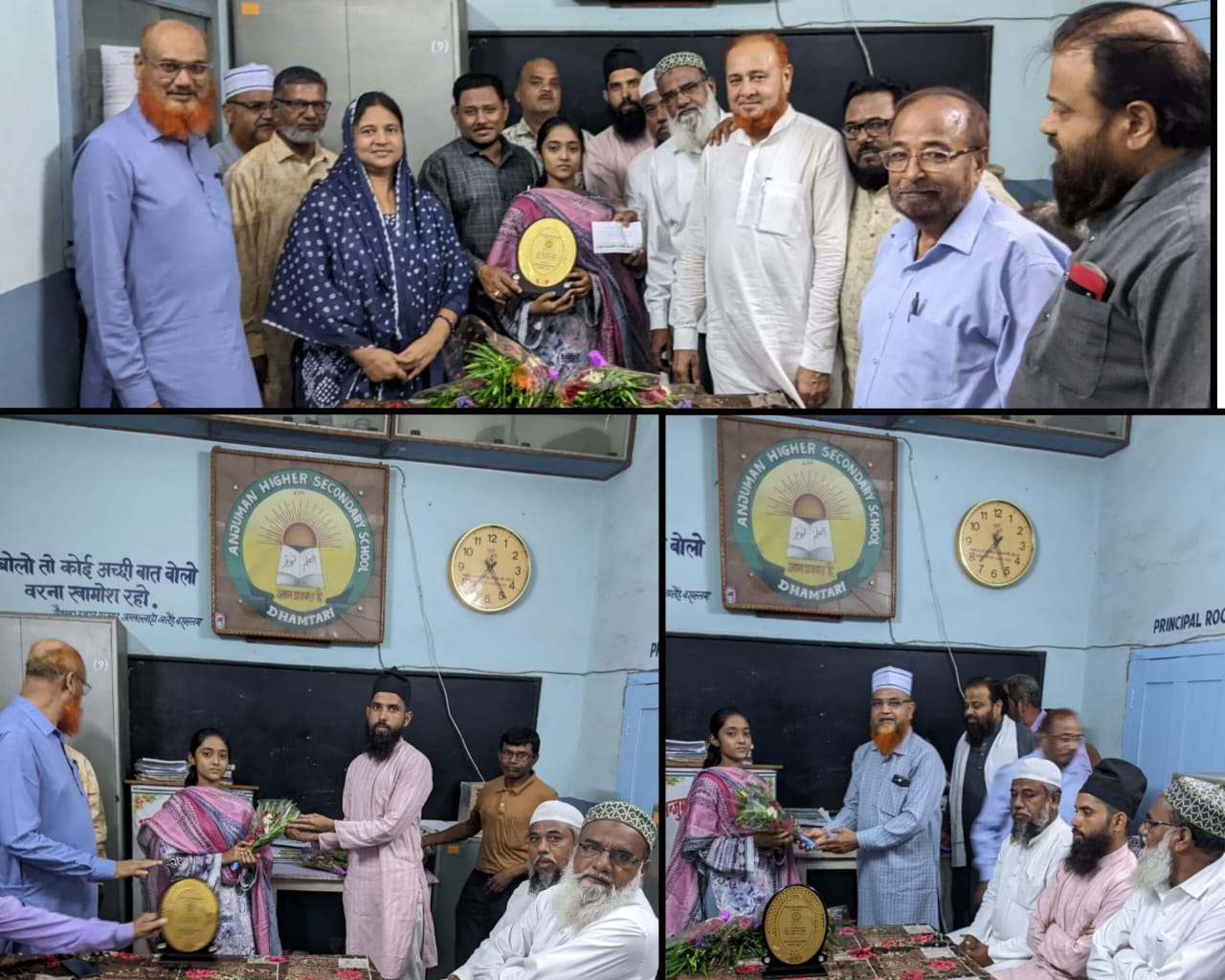 धमतरी/ मुस्लिम समाज की गौरव दसवीं की होनहार छात्रा काफिया परवीन ने शिक्षा सत्र 2024-25 में कक्षा दसवीं की बोर्ड परीक्षा में 93.16 प्रतिशत अंक हासिल कर टैलेंट पब्लिक स्कूल, परिवार और समाज को गौरवान्वित किया है। टैलेंट पब्लिक स्कूल में अध्यनरत छात्रा काफिया परवीन पिता मरहूम शेख आसिफ की इस उपलब्धि पर अंजुमन इस्लामिया कमेटी ने अंजुमन स्कूल में उसे सम्मानित किया। काफिया को यादगार भेंट और 3100 रुपए प्रदान कर उसके हुनर को सलाम किया गया।