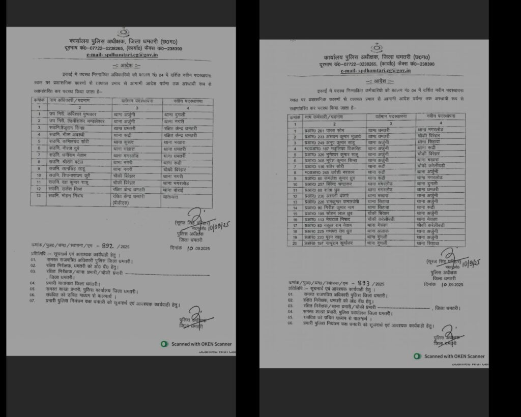 धमतरीं/ जिले में पुलिस व्यवस्था को और अधिक चुस्त-दुरुस्त बनाने तथा प्रशासनिक कसावट लाने हेतु पुलिस अधीक्षक धमतरी सूरज सिंह परिहार द्वारा तबादला आदेश जारी किया गया है।
